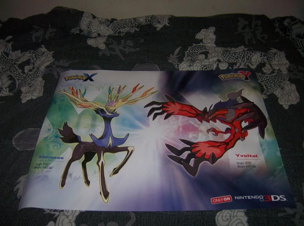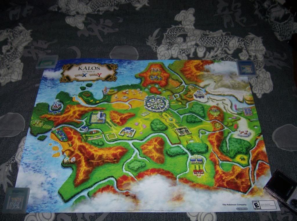 The Pokémon poster I was given - Front side (Using copies of Blue, Crystal, and Emerald, as well as my Game Boy Color, to weight down the corners)