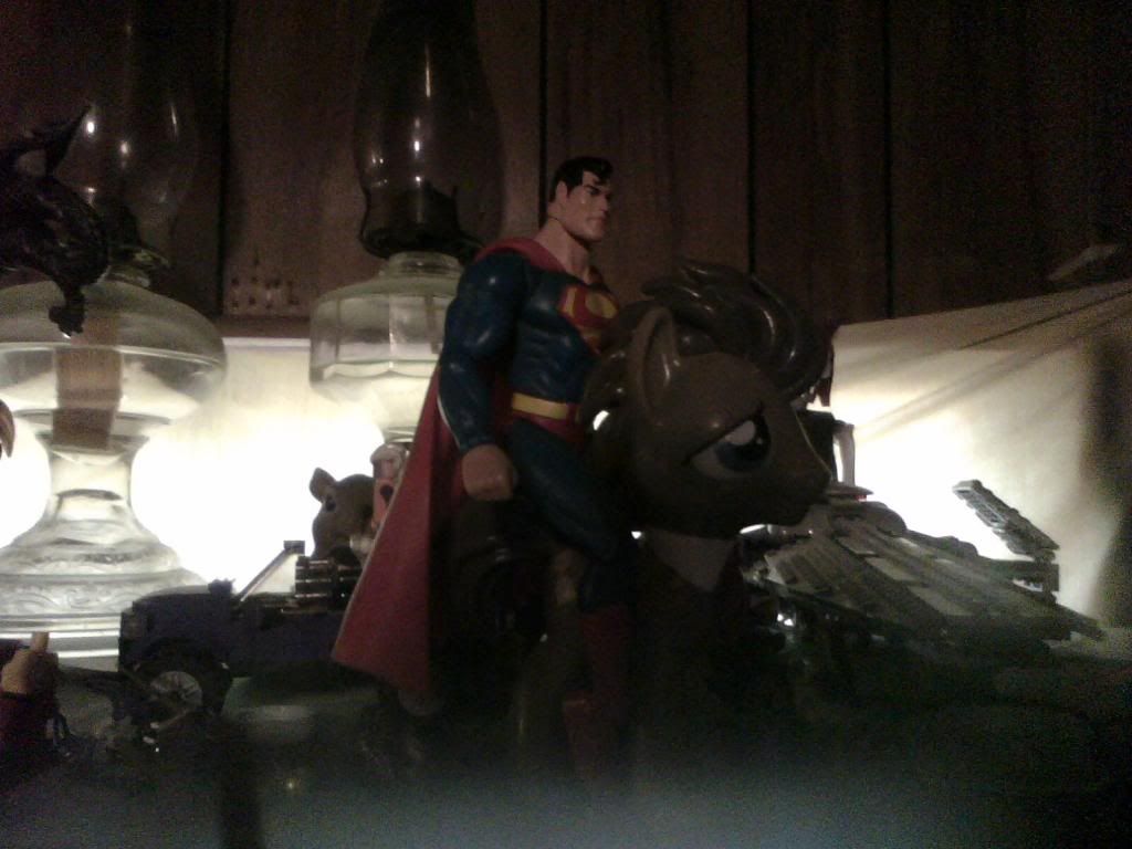 Superman riding on Dr. Whooves, at my sister's house -w-