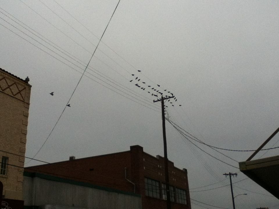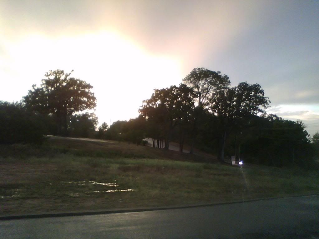 The sun setting behind the trees, looking from the back door at work. For the curious, there is a funeral home and a call center on the hill you see.