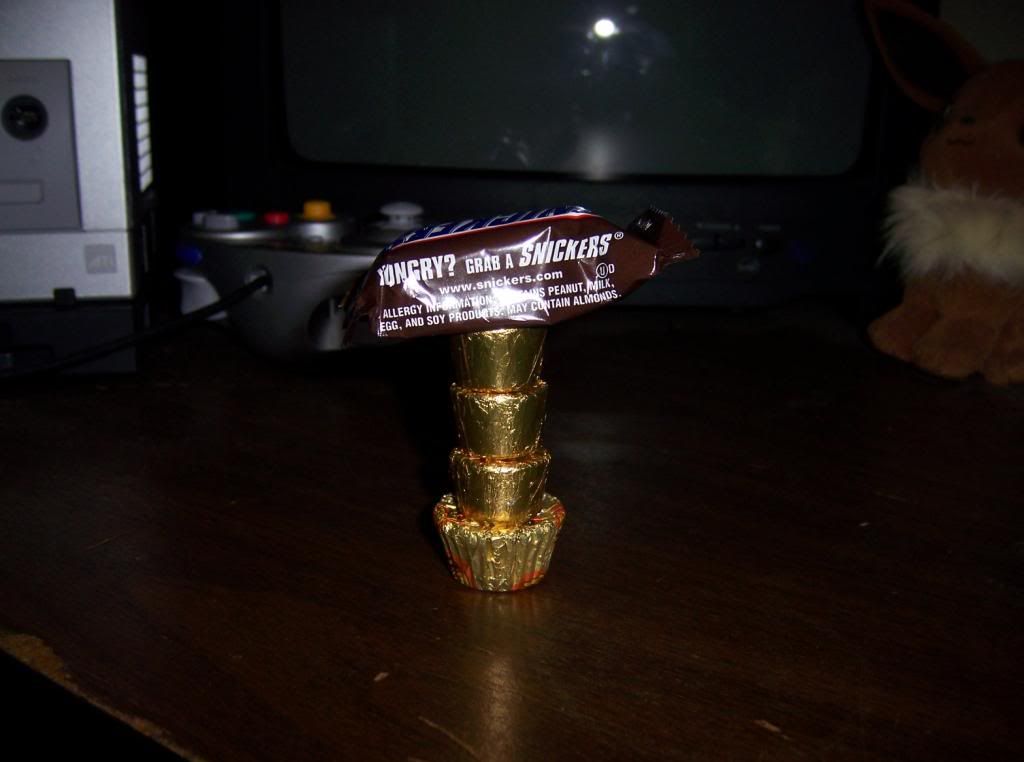 A tower of candy. That's one Reese's, three Rolos, and a Snickers -w-