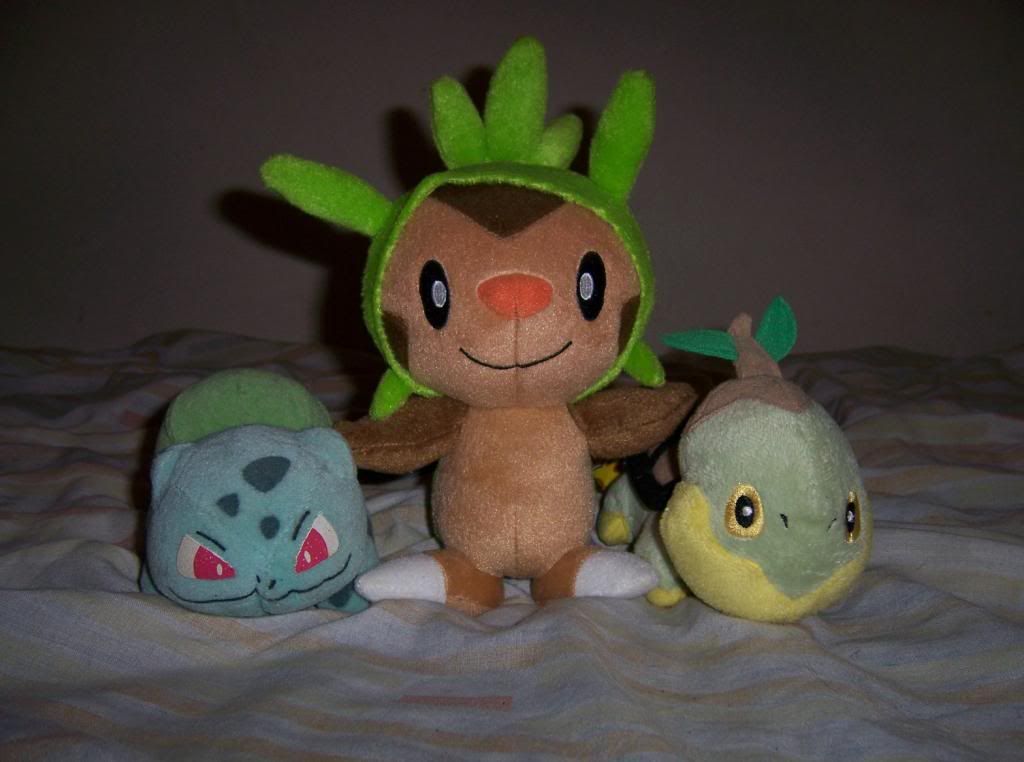 Plushies of grass starters from Pokémon. You have Alfonse (Bulbasaur), Chozo (Chespin), and Roshi (Turtwig) :3