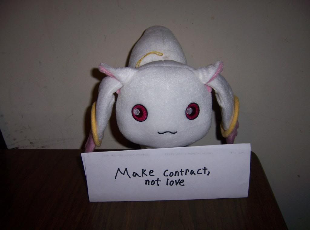 Purchased a plushie of Kyubey, who quickly tried to make contracts with myself and Maka. It's kind of his thing -w-;