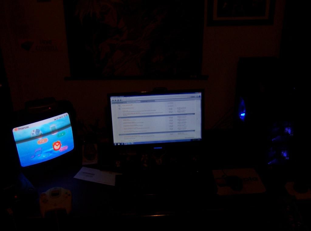 My desk, currently with Dreamcast setup (Pardon the messy bits behind the monitor; I didn't realise how it looked until I saw the pic -w-; )