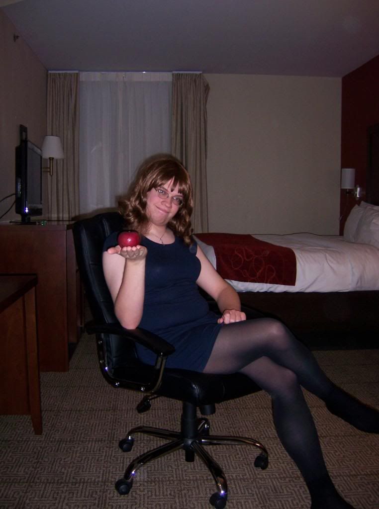 So, I decided to take a few new pics of my PDP-11-tan cosplay; this time remembering my wig and tights (Sadly, no labcoat, but a DEC logo pin I put on my sweater). They follow below: