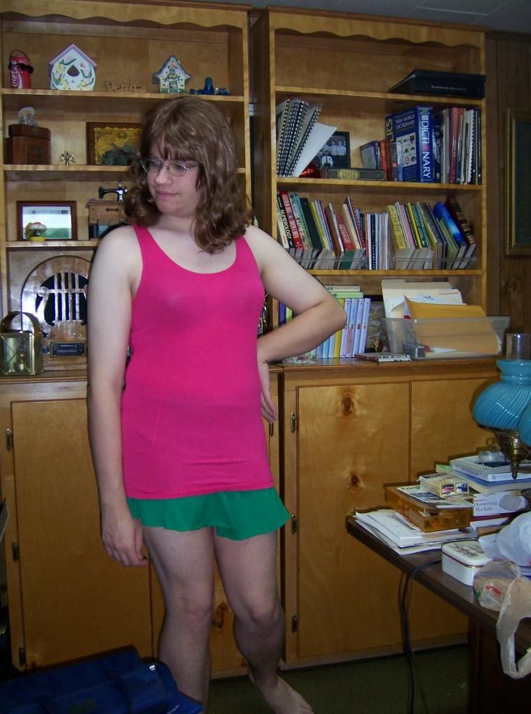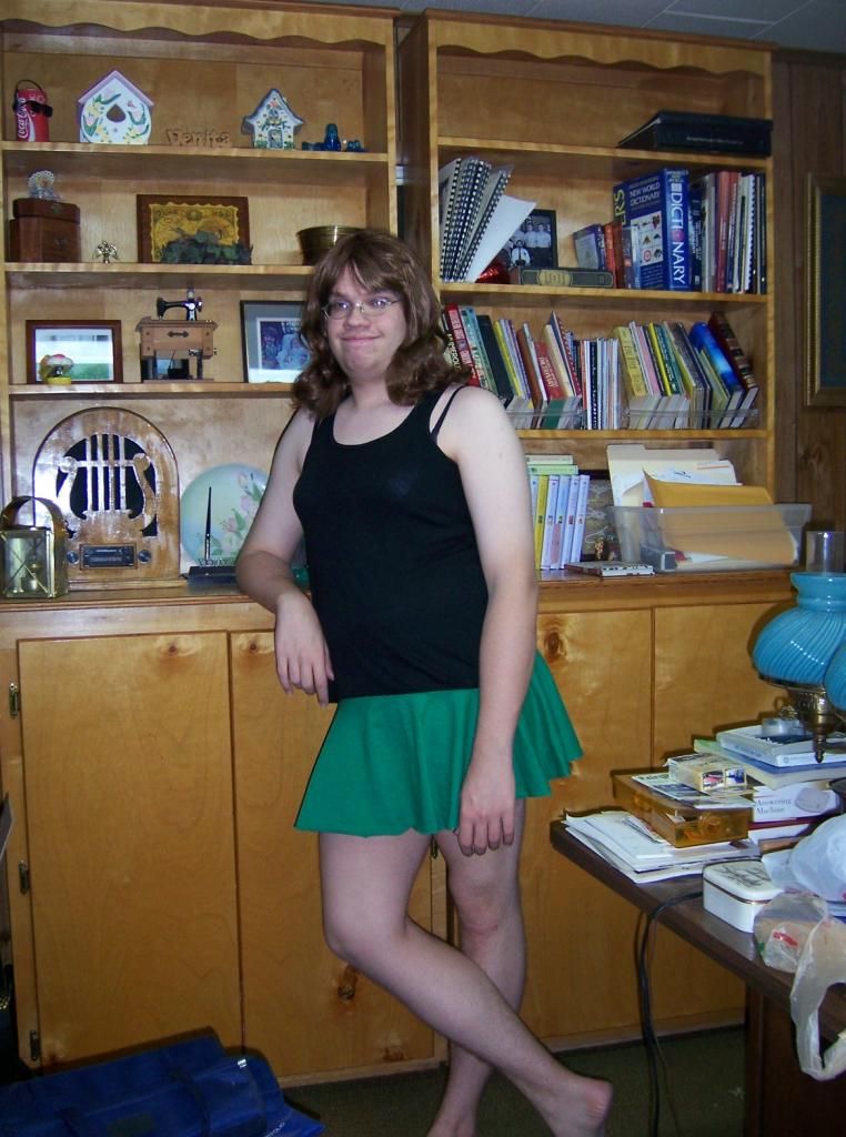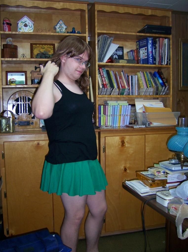 - Bella tanktop with green miniskirt. I love this combo; it's simple but comfy for around-the-house wear, as shown here with me relaxing :3