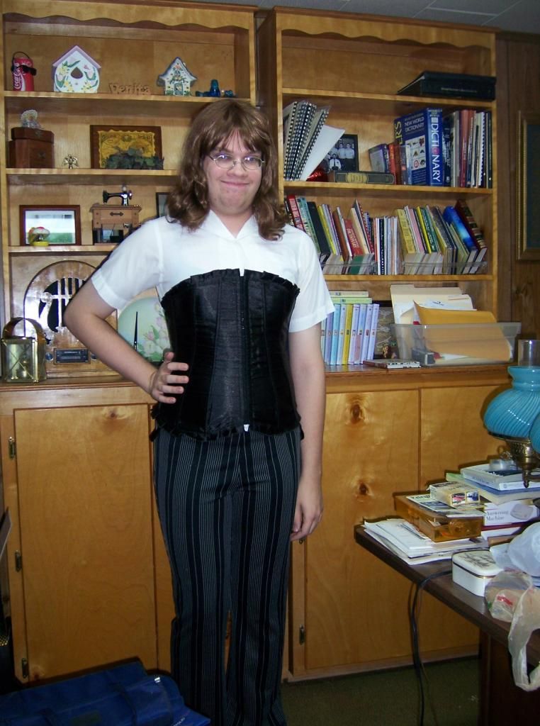 The miniskirt + corset combo looks pretty good, get a black petticoat to go with it and some other accessories and it'd be a nice ensemble. Don't really like the color clash between that shade of pink and green but it looks good with the black shirt.